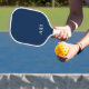 Trendy pickleball paddle features a dark navy blue background,Add your initials or monogram in bold white text for a look that is simple and cute,