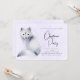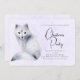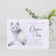 Christmas invitation with a watercolor image of a white fox with fancy blue flora designs all over its fur.