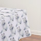 Patterned tablecloth with a watercolor image of a white fox with fancy blue flora designs all over its fur.