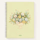 A light green notebook with hand-drawn creamy-white and yellow flowers loosely coloured for school girls.