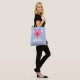 This cute tote bag for nurses features a pink heart with a pattern of red in the centre with another smaller heart and a background pattern of pink hearts on a blue background. Personalize with a name. Designed by world renowned artist ©Tim Coffey.