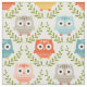 Cute fabric featuring assorted colourful owls and laurels. Coordinating fabric available in the shop.