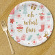 A playful Christmas paper plate design with the message, Oh what Fun. It is decorated with pretty illustrations of presents, mittens, a Christmas stocking, a Christmas tree and a reindeer. A fun party plate for the holiday season. Designed for you by Blackberry Boulevard.