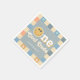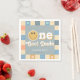 This groovy boys 1st birthday napkin design captures 70s vibes with a cute blue theme, and a pastel chequered border. Fully customizable, it includes space for a name in a retro script. Perfect for a "One cool dude" boho birthday, this playful design adds charm to your little one's special day!