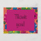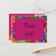 Cute and girly, child's birthday, "thank you" card. Brightly coloured flowers sit on a vibrant orange background. In the centre is the message, written on a magenta / purple / pink box