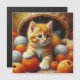 Sweet little orange striped kitten playing in a basket of balls of orange and white yarn.