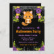 Cute orange cat Floral Halloween design with a black polka dot background and black dripping glitter