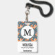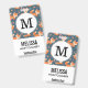 Name badge with a pattern made with cute and happy orange foxes. Dark green background. Little mushrooms and leaves sprinkled about.