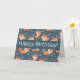 Happy Birthday greeting card with a pattern made with cute and happy orange foxes. Dark green background. Little mushrooms sprinkled about.