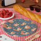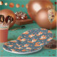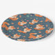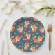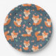 Paper plates with a pattern made with cute and happy orange foxes. Dark green background. Little mushrooms and leaves sprinkled about.