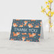 Thank you card with a pattern made with cute and happy orange foxes. Dark green background. Little mushrooms sprinkled about.