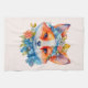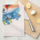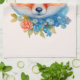 A kitchen towel with an illustration of an adorable fox portrait with a blue and orange floral crown and collar.