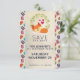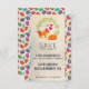 A save the date card with a drawing of a cute fox sleeping peacefully. A green leaves wreath behind and some little hearts floating around. The background is a pattern with pale polka dots and colourful macarons layered over top
