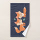Towels with a graphic illustration of 2 orange foxes looking cute and happy.