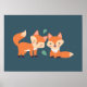 A poster with a graphic illustration of 2 orange foxes looking cute and happy. Dark green background.