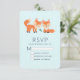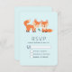 RSVP card with a graphic illustration of 2 orange foxes looking cute and happy. Light blue background.