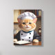 Adorable orange tabby cat dressed as a professional chef, holding a cookbook in a cozy kitchen. Perfect for food lovers, cat owners, and anyone who enjoys humourous pet artwork.