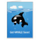 Bande dessinée adorable de baleine d'Orca avec un petit coeur blanc près de sa queue. Le recto de la carte dit : Attrape Bientôt la BALEINE !