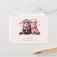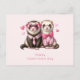 Valentine's Day postcard with with a cute illustration. A pair of otters in pink people clothing. Wearing striped shirts and one wearing a tie and the other wearing a bow. Surrounded by love hearts.