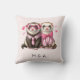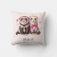 A pillow with a cute illustration. A pair of otters in pink people clothing. Wearing striped shirts and one wearing a tie and the other wearing a bow. Surrounded by love hearts.