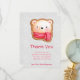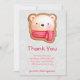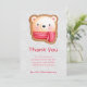 Carte de remerciements plat avec un joli et adorable visage d'ours dressé sur une base de biscuits. Portant un foulard rayé rouge et blanc. Arrière - plan est argent avec un motif de cercles aléatoires.