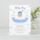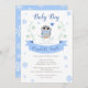 Baby boy winter baby shower invitation. Design features a cute illustrated owl with blue scarf along with blue snowflakes and winter florals.