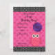5" x 7" invitation with cute pink owl pink butterfly pattern background, with black stripes with white polka dots a purple scallop circle to change the birthday year for 1st, 2nd, 3, 4, 5, 6, 7, 8, 9, 10, 11, 12, 13 14, 15, 16, 17, 18, 19, 20, 30, 40, 50, 60, 70, 80 ,90 owl themed birthday party invite