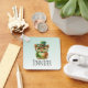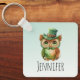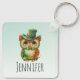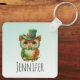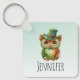 Personalized keychain with a wonderful whimsical illustration. A big eyed brown owl wearing a fancy green top hat and bow tie.