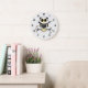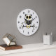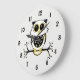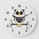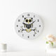 Custom Wall Clock has a cute vector graphics art design of a yellow, black and white monochromatic owl on a branch with berries and leaves.