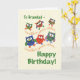 A fun birthday card for a Grandad with cute and colorful owls on a parchment-colored background, from a hand-painted paper collage by Judy Adamson. A custom front version of this birthday card is also available in case you want to use it for a different relation or a specific person and you can change the inside message if you wish.