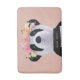 A cute panda bear with flowers in her hair, all on a peach colored background. Just add your name! Available in three sizes.