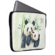 Personalized laptop sleeve with a cute watercolor illustration featuring a black and white mom and baby panda bear cuddling together. Mommy is holding her cub amongst some green bamboo stalks.
