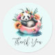 Thank you stickers with an adorable summery image. A watercolor design with a black and white panda sitting in a swimming ring in the water. Surrounded by pretty wildflowers. A totally chill bear.