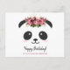 Cute panda Happy Birthday postcard. Kawaii black and white panda bear face with floral crown.