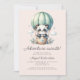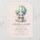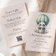 This cute baby shower invitation features a sweet watercolor panda in a mint green hot air balloon, above the words "Adventure awaits!" in charcoal grey script. Personalize the text with the name of the mom-to-be in script and the details in sans serif font on a pale blush pink background. The reverse side provides space for diaper raffle, books for baby, and registry details, along with a convenient QR code guests can scan to visit the registry. Ideal for a girl's baby shower.
