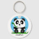 Cute black and white panda bear holding a green bamboo shoot. He is sitting on some green grass with a blue sky background. Below the panda is a template in black lettering to add your name to personalize this illustration.