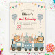 This adorable personalized birthday invitation features a collection of cute and whimsical safari animals, all wearing colourful party hats, on a charming train.