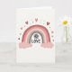 This greeting card features a softly curved rainbow in muted bands of dusty rose, blush pink, warm taupe, and a grounding gray stripe on a white background. Two peach-toned clouds sit at the base of the rainbow, giving the design a cozy, caring feel. Small hearts and tiny dots are scattered around the card in shades of pink and red-brown, adding a sweet touch of affection ❤️. Near the center, the word “LOVE” is printed in simple black block letters, easy to read and calm in style. Just above the word is a small outlined daisy with a light pink center, like a gentle little reminder of kindness. The layout feels balanced and light, with the hearts floating around the main image without taking over. It’s a thoughtful choice for romance, friendship, or a simple “thinking of you” note