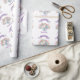 This cute and colourful wrapping paper features a beautiful illustration of a unicorn and pastel coloured rainbow. Little stars in matching colours surround the rainbow. A sample Happy Birthday banner is printed above the unicorn, and a sample name is printed below in an elegant purple script font. You can personalize the gift wrap to include your own custom name or text.