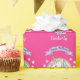 This cute and colourful wrapping paper features a beautiful illustration of a unicorn and pastel coloured rainbow, over a hot pink background. Little stars in matching colours surround the rainbow. A sample Happy Birthday banner is printed above the unicorn, and a sample name is printed below in an elegant purple script font. You can personalize the gift wrap to include your own custom name or text.
