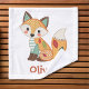 This personalized kids' wash cloth features a cute, whimsical fox created in a patchwork style. The fox is designed with a mix of colourful, patterned fabrics, including polka dots, stripes, and leafy textures.