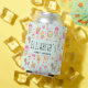 Baby shower can cooler with a whimsical pattern featuring a collection of delightful children's toys and animals. A rectangle shape layered over top with your personal details inside.