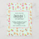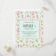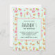 Birthday party invitation postcard with a whimsical pattern featuring children's toys and a collection of cute deer, giraffe, bears, and more delightful animals.