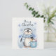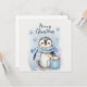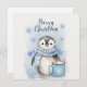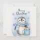 A charming winter illustration of an adorable little penguin wearing a blue striped hat and scarf, bringing a cozy and festive vibe. The soft snowflakes and gentle blue tones in the background create a magical winter atmosphere. Perfect for Christmas cards, posters, stickers, and seasonal crafts!