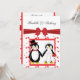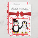 A cute penguin wedding invitation featuring 2 penguins, the bride penguin is dressed in a white wedding dress with a heart tiara veil carrying a red rose bouquet and the groom penguin with a red bowtie and top hat with a red band surrounded by floating red hearts topped with a red sash and bow!