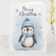 A charming winter illustration of an adorable little penguin wearing a blue striped hat and scarf, bringing a cozy and festive vibe. The soft snowflakes and gentle blue tones in the background create a magical winter atmosphere. Perfect for Christmas cards, posters, stickers, and seasonal crafts!