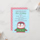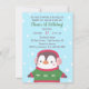 A birthday party invitation suited for the winter holidays! It features a cute little penguin dressed warmly and cozily with green sweater with fishes and hearts print and ear muffs. Falling snow in the background.