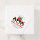 Three cute and festive Christmas penguins bring holiday cheer to your gift wrapping and envelopes. The centre penguin is holding a present above his head. The penguin on the left has a red and green elf hat on and the one on the right has a reindeer antlers. We wish you a merry Christmas and a happy new year is written in red and green fonts. Your name completes the design.