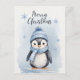 A charming winter illustration of an adorable little penguin wearing a blue striped hat and scarf, bringing a cozy and festive vibe. The soft snowflakes and gentle blue tones in the background create a magical winter atmosphere. Perfect for Christmas cards, posters, stickers, and seasonal crafts!