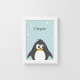 Children's poster of a cute pingvin on an blue background. The perfect print to add in the kids' room or as a funny decoration in your home interior.